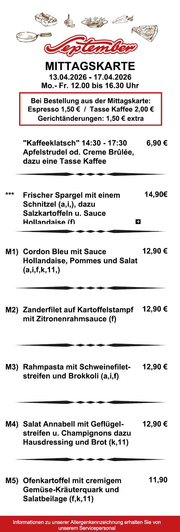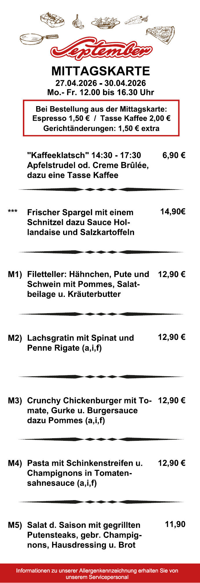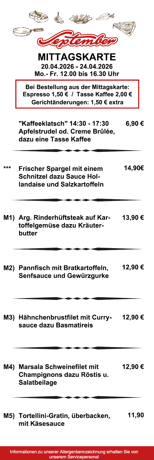 September. Restaurant - Bar - Café Spargelzeit Mittagskarte Willkommen In Bremens Innenstadt September - kernige Küche Willkommen im September. Ihr Restaurant in der Bremer Innenstadt - fußläufig von der Sögestraße entfernt. Ob Frühstück, Salate, Pasta, Pizza, Schnitzel, Bürger oder auch Überbackenes. Wir haben eine leckere Küche. Hier gehts zur Speisekarte Die Highlights aus der Küche Schmackhafte Zutaten, leckere Gerichte SchnitzelOb Hähnchen oder Schweinmit Wedges und Salat,oder doch klassisch mit Pommes, suchs dir aus! ab 16,90€ SpaghettiSpagetti Bolognese - ein echter Klassiker - 13,50€ PizzaOb klassisch oder etwas ausgefallener, unsere Pizza schmeckt ab 12,50€ AufläufeMit Fisch, Fleisch oder auch Vegetarisch ab 13,50€ Burger"Klassisch", mit Käse oder Chicken ab 16,90€ Unsere komplette Speisekarte Besondere Tage: klassisches AbendessenFußball-Livestream Zurück Weiter Mehr dazu